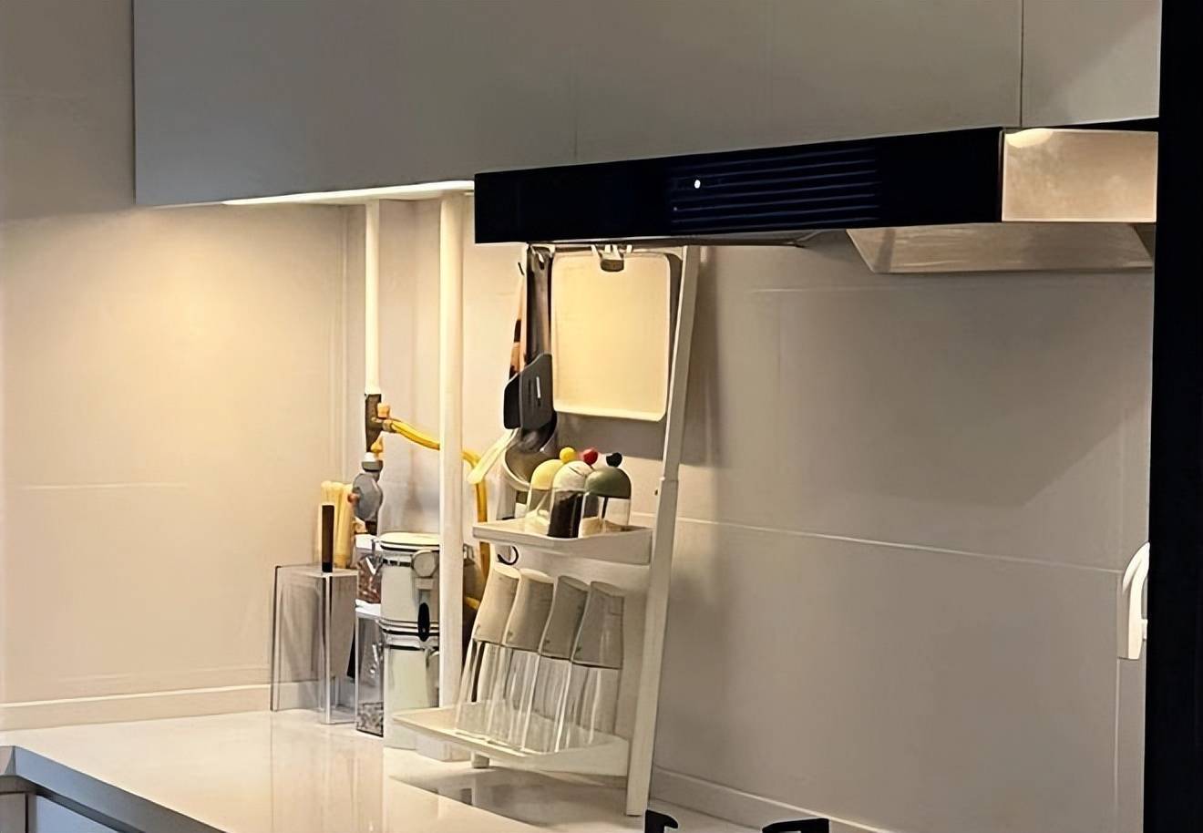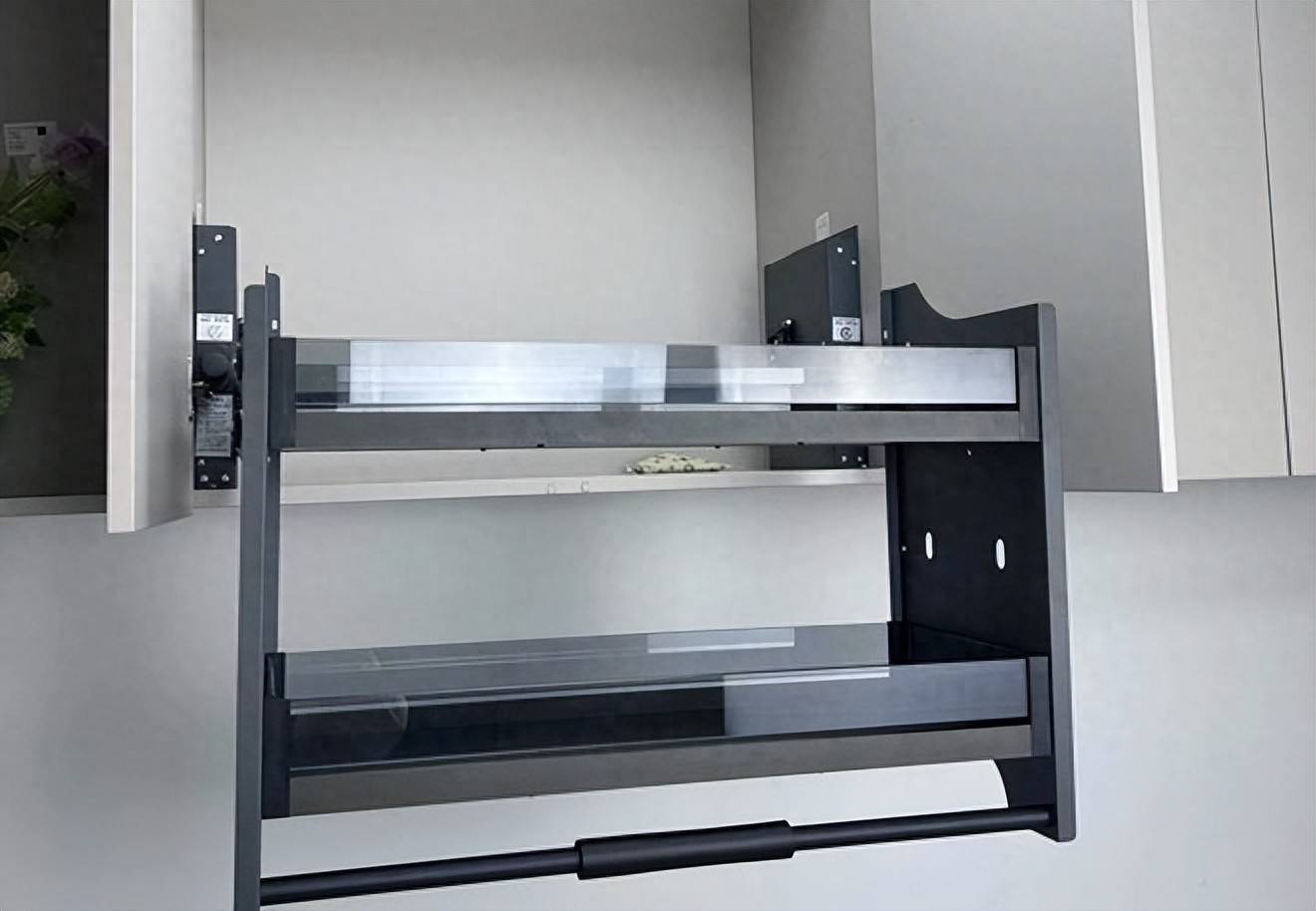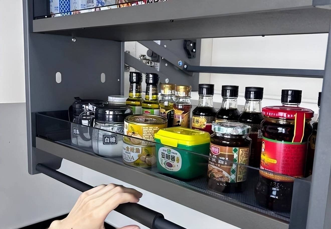 神设计亮点:吊柜侧边安装升降拉篮(宽40cm×深45cm),分层收纳调料、酱料与油,具备液压缓冲功能,轻拉稳降。