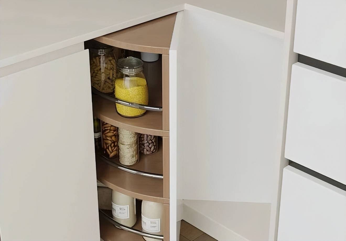 和面时调低高度(75-85cm),切菜时调高(90-100cm),炒菜可根据习惯微调,每个人都能找到舒适高度; 静音设计安静不扰人,防夹手功能安全系数高,老人小孩使用安心; 一块台板满足所有操作场景,提升厨房幸福感。 避坑提醒:选择品牌电机(如百隆),承重与稳定性更有保障;将升降速度调至中慢,避免急停晃动。4. 旋转角落柜|极致利用死角空间,锅具小家电取用便捷核心痛点:厨房拐角空间利用率低,放置物品占地方,取用深处物品不便,空间浪费率超50%。