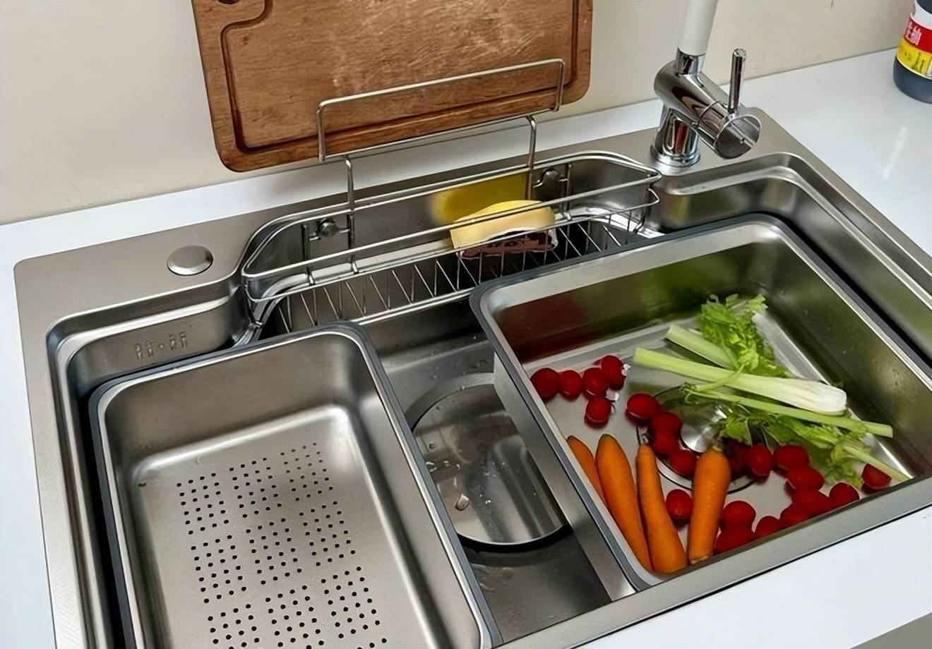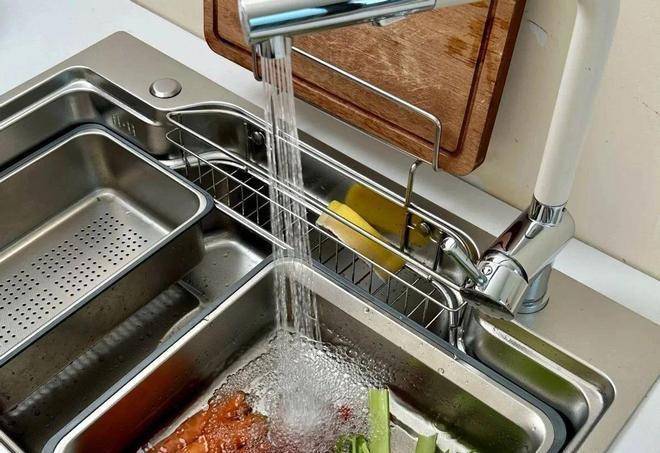 调料藏于吊柜,台面瞬间整洁,烹饪时随手可取,使用后推回无痕; 远离灶台,免受油烟直熏,瓶身始终清爽,无需擦拭油垢; 分层设计防止串味,取用更有序。 避坑提醒:选择304不锈钢材质更耐用,承重≥10kg/层,安装位置避开灶台高温区。2. 一体化沥水槽|简化流程,高效备餐,厨房小白也能轻松驾驭核心痛点:单槽或双槽使用不便,洗完菜需另找沥水篮,果皮垃圾散落一地,洗切过程衔接不畅。