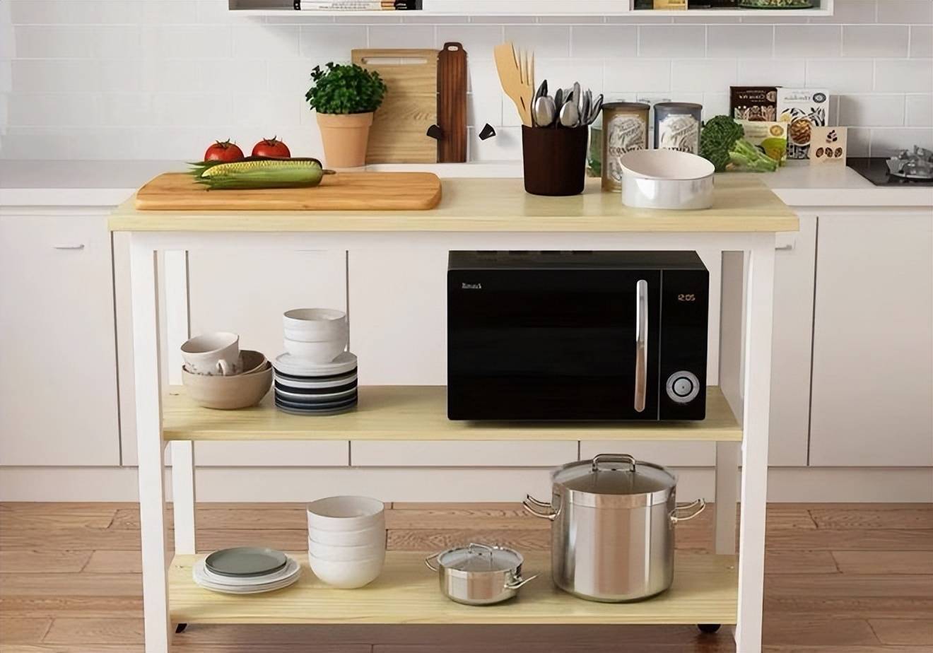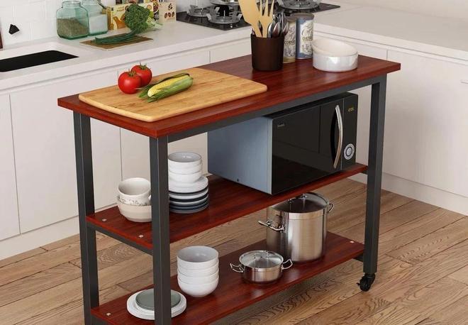 将死角转变为“黄金收纳区”,锅具、小家电、干货均可收纳其中,利用率提升90%; 旋转取物无需弯腰翻找,轻轻一转即可获取,拿取效率翻倍; 阻尼缓冲防止夹手,开合安静无磕碰,使用更安心。 避坑提醒:预留旋转半径≥60cm,避免撞墙;内部层板高度可调,适配不同大小物品。5. 移动备餐台|打造厨房“流动工作站”,小厨房也有大操作空间核心痛点:备菜区与水槽、灶台距离远,端拿食材往返奔波;操作台面不足,切菜需“见缝插针”。