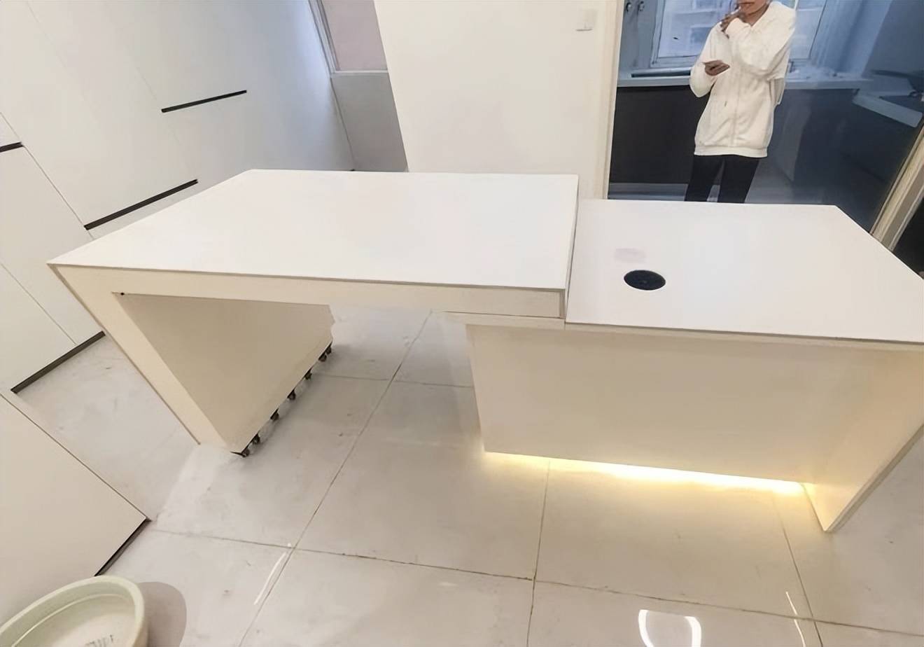神设计亮点:中央岛台安装电动升降台(高度75-110cm可调),采用静音电机与双液压支撑,承重100kg,并具备防夹手感应功能。