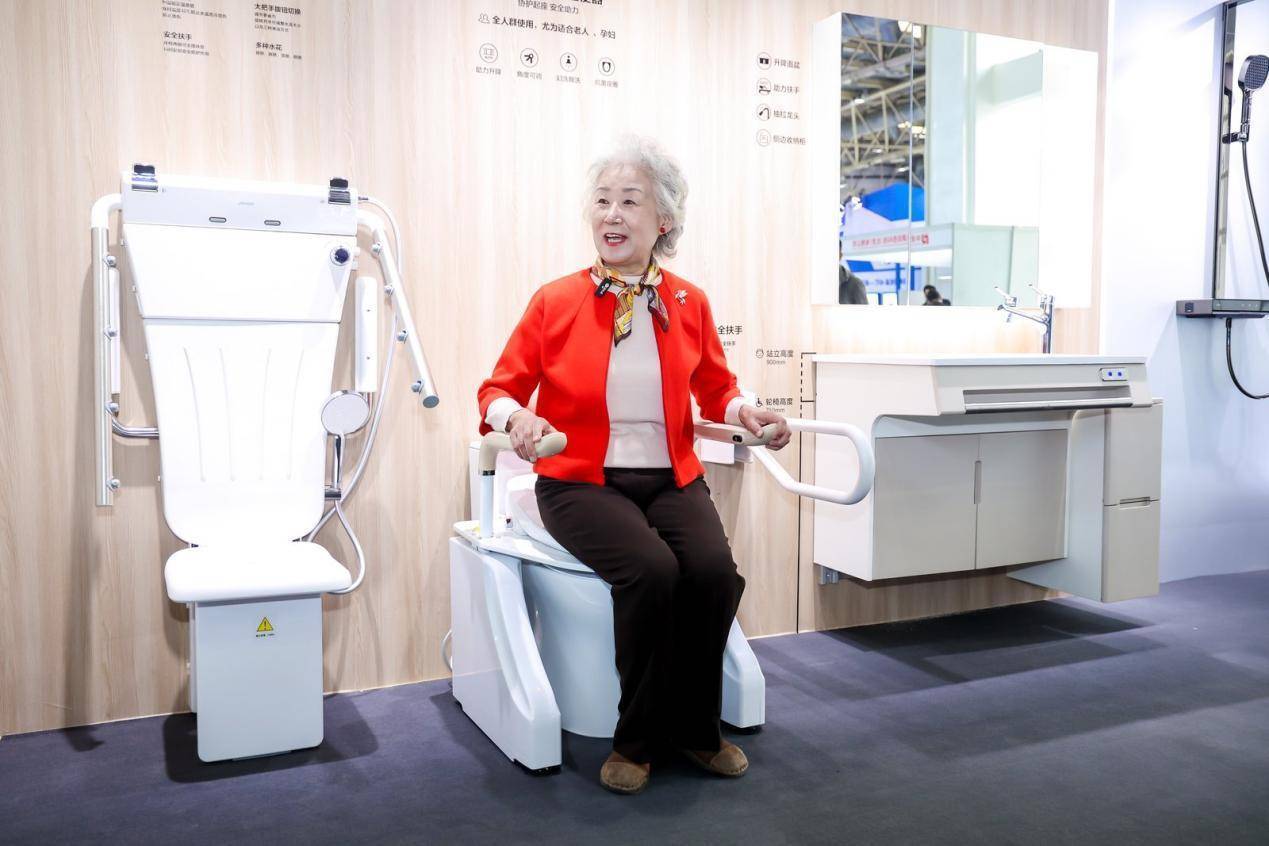会议现场,九牧一系列智能卫浴适老产品同步展出,包含九牧行业首款AI智能马桶X70、自动除垢钢琴键数显淋浴器X100等。(文/袁新 图/九牧集团)