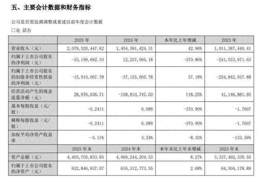 年报数据显示,公司2025年实现营业收入20.80亿元,同比大增42.96%,然而归属于上市公司股东的净利润却为-3319.97万元,同比暴跌370.86%。